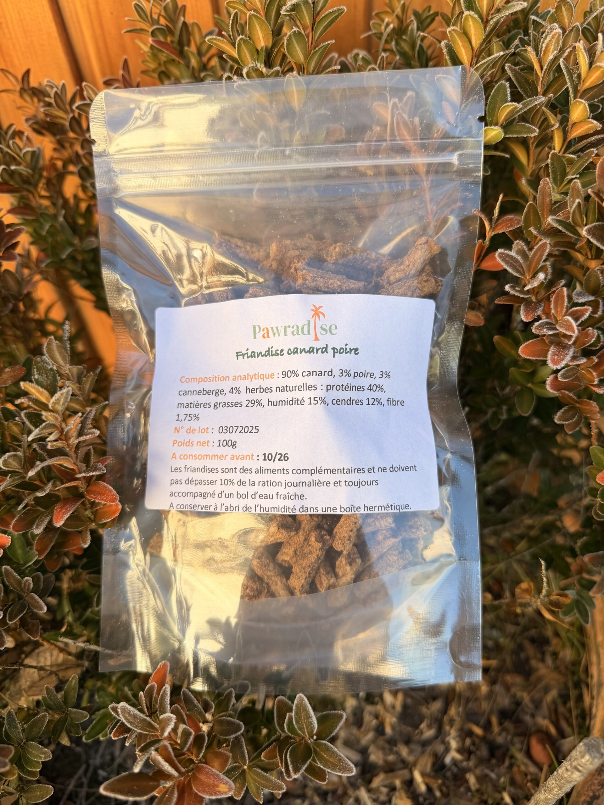 Ingrédients: 90% viande de canard, 3% poire, 3% canneberge, herbes naturelles