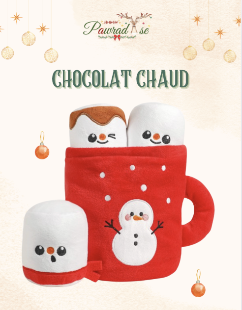 Le jouet Chocolat chaud comprend une tasse en peluche froissée et trois guimauves qui couinent, offrant à votre chiot une variété de textures et de sons à explorer.